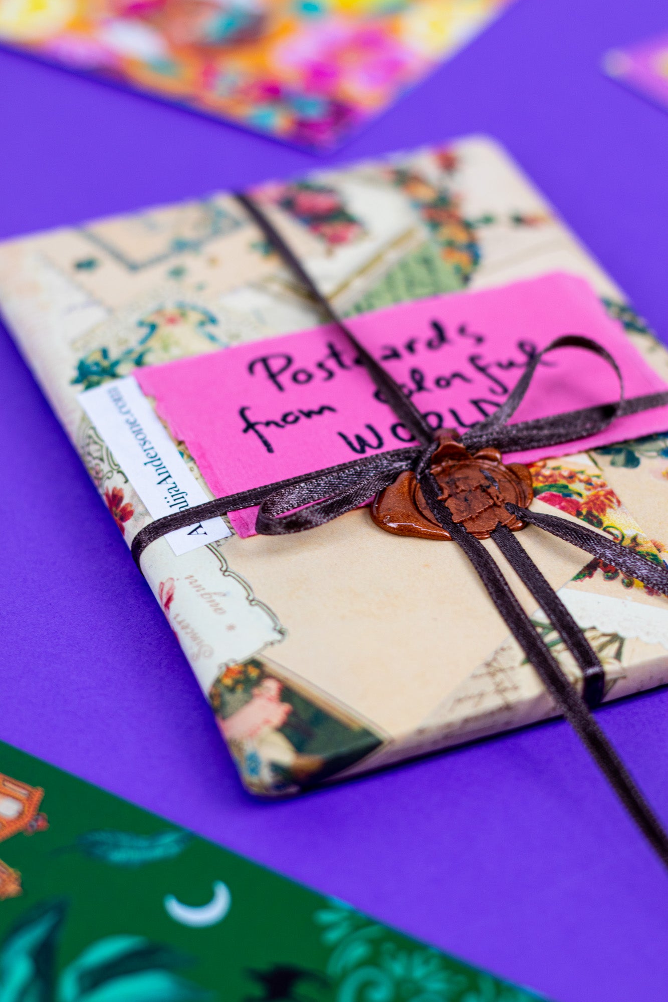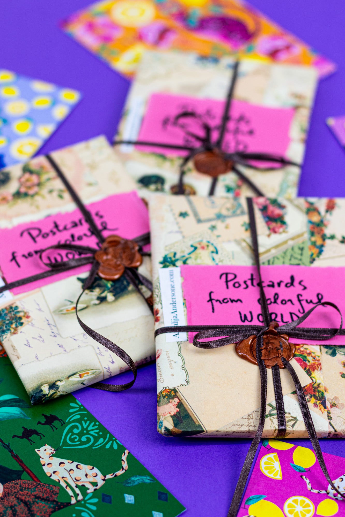 Mākslas pastkaršu komplekts - satur 15 kartiņas, ar rokām iesaiņotas dāvanu papīrā ar lentu un zīmoglaku. Ierobežots daudzums - trīs komplekti kopā.