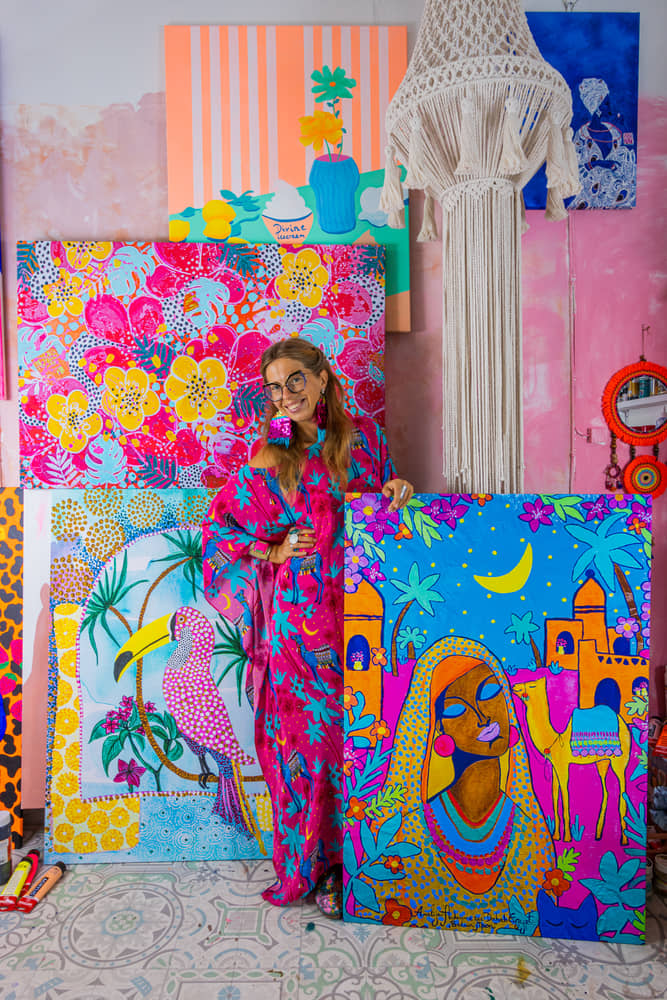 This painting was made while I was living alone in a Bedouin hut by the Red Sea, on a sandy street in Dahab, where palm trees sway in the warm wind, the moon rises over the sea, Arabic music plays from passing cars, herds of goats run past in the early hours of the morning, the sound of prayers echoes over the city . Dahab inspired me to paint fluorescent colors, Bedouin moon, pink flowers, blue sky, vanilla dessert-scented flowers, starry nights, Bedouin princesses, camels and Dahab cats.