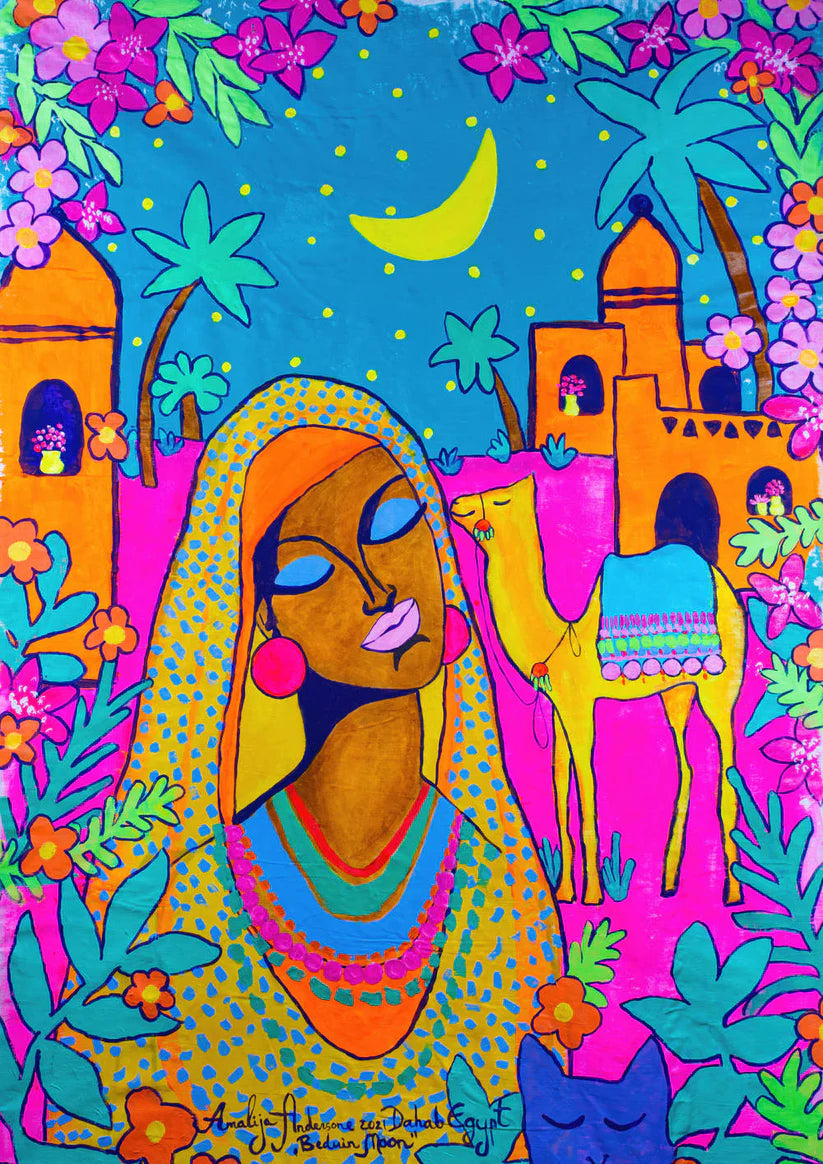 This painting was made while I was living alone in a Bedouin hut by the Red Sea, on a sandy street in Dahab, where palm trees sway in the warm wind, the moon rises over the sea, Arabic music plays from passing cars, herds of goats run past in the early hours of the morning, the sound of prayers echoes over the city . Dahab inspired me to paint fluorescent colors, Bedouin moon, pink flowers, blue sky, vanilla dessert-scented flowers, starry nights, Bedouin princesses, camels and Dahab cats.