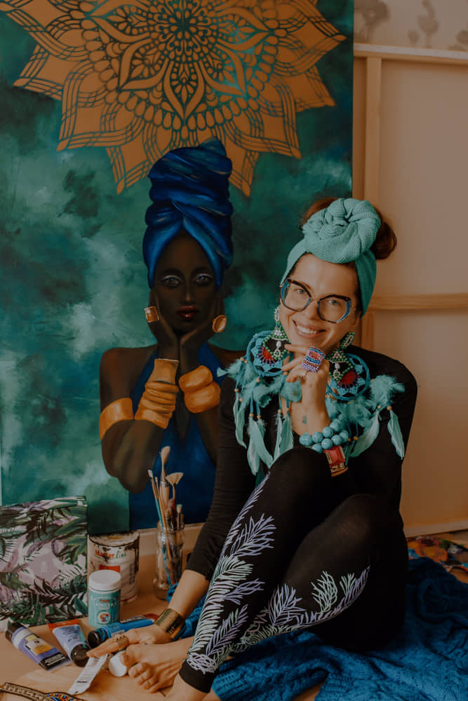 A painting that took a long time, in which many personal and creative feelings are embedded - from the inspiration of late autumn, deep winter, night dancing in woolen socks to the music of King Charles, ignorance, the search for courage and inspiration to making bold decisions in the spring. Gold dotting helped me survive, think and feel during a period of creative depression. Gold always helps and heals me. Gold makes you dream of Africa and an exotic life.