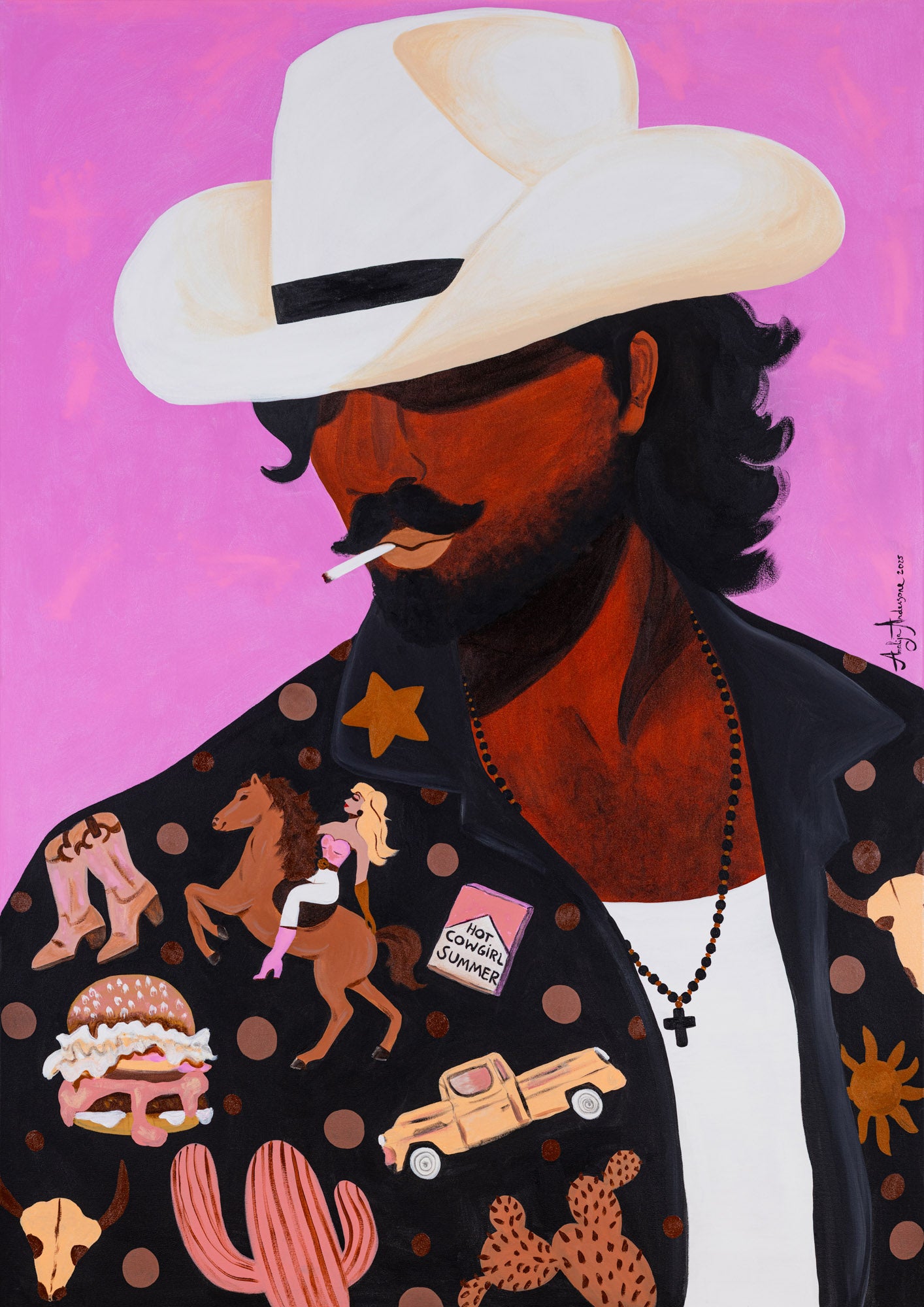 My wild west cowboy, riding on a horse into the pink sunset as a cloud of dust rises in the nearby cactus groves. For dinner, he eats a steak and a burger for dessert, takes a sip from a leather bag, smokes a cigarette and lazily enjoys the warm evening. Country music is playing in the distance, a big truck pulls up, girls in beautiful dresses get out and the party can begin.