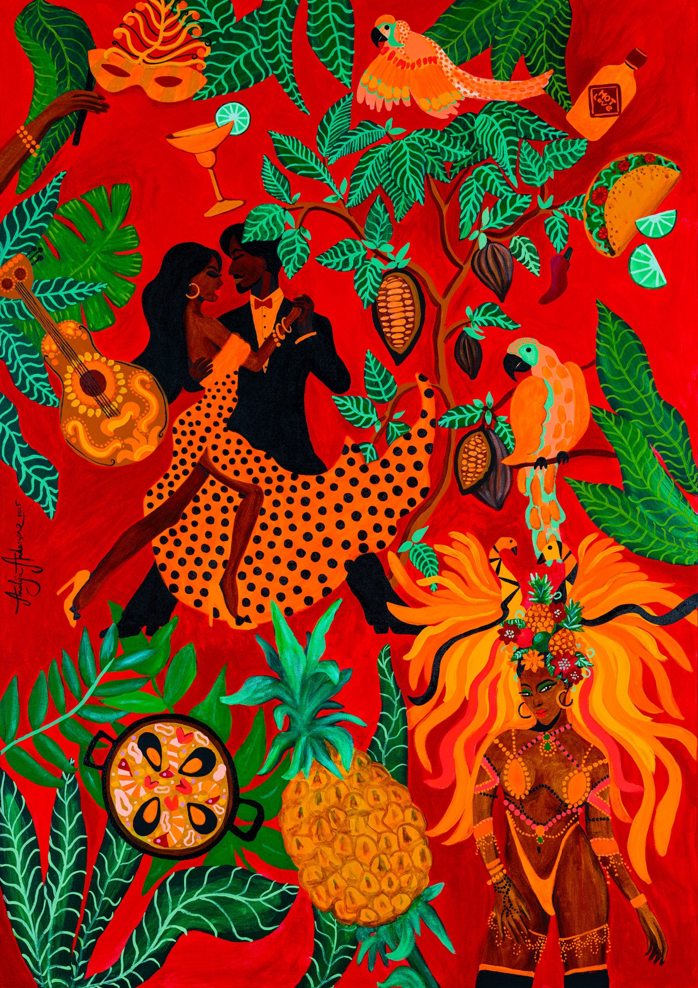 Passionate tango and samba dancing in the hot sun. Music that makes your hips sway. Brazilian carnival dancers. Gorgeous masks and cocktails to celebrate life. Cocoa, paella, tacos and passionate love in the jungle accompanied by parrot songs.